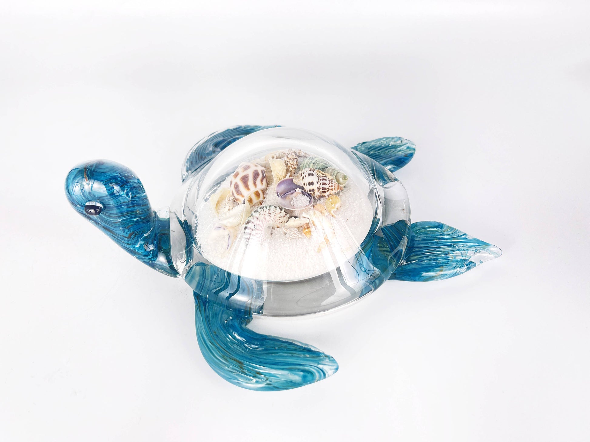Bring the tranquil beauty of the ocean into your home with this Art Glass Sea Turtle. This stunning handcrafted piece features a detailed glass sea turtle with natural sand and sea shells sealed inside using a cork. encapsulating the essence of coastal charm and artistry. Each sea turtle is individually hand-blown by skilled artisans, making every piece one-of-a-kind. The vibrant hues and intricate patterns in the glass mimic the ocean’s iridescence, creating a mesmerizing and lifelike representation of this majestic marine creature. 9 x 9 x 4 in